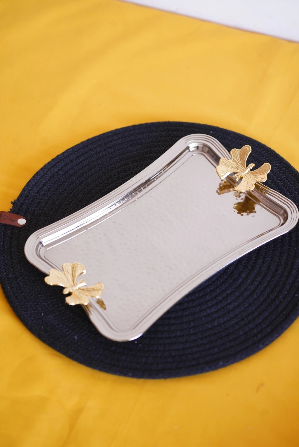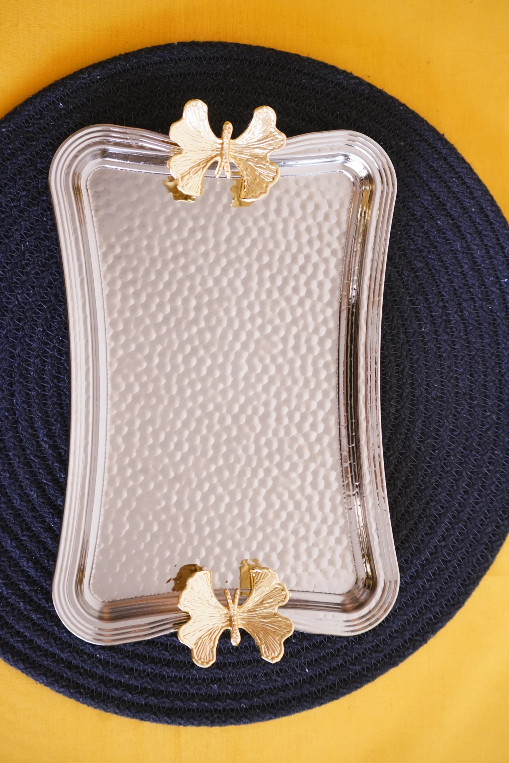 Cooker Dikdörtgen Dövme Desenli Kelebekli Kulplu Metal Tepsi 25x17 cm