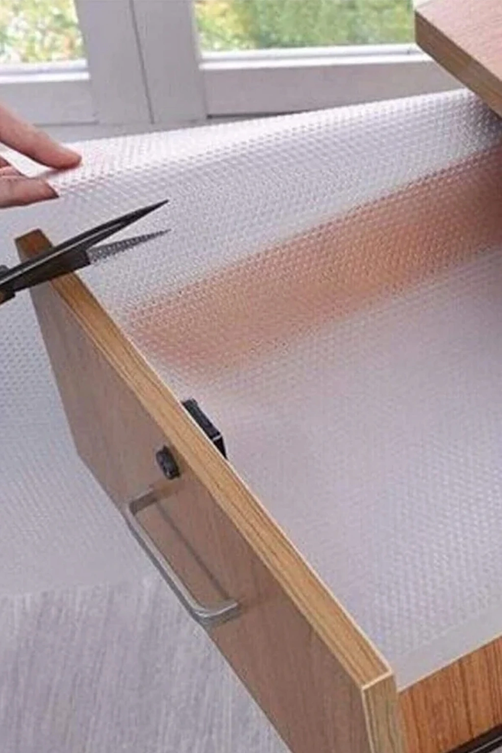 Uzunluk: 5 METRE, GENİŞLİK: 45 CM ; RENK: RENKSİZ/ŞEFFAF ; ÜRÜNÜMÜZ KAYMAZ TABANLIDIR.; LEKE TUTMAZ.; YIKANABİLİR YADA SİLİNEBİLİR.; TEMİZLEMESİ OLDUKÇA KOLAYDIR.; DOLAP RAFLARI, AYAKKABILIK,BUZDOLABI VE ÇEKMECE İÇLERİNE KULLANABİLİRSİNİZ.; 45 cm x 5 metre dir.; Uzunömürlü yıkanabilir kaydırmaz %100 eva malzemeden üretilmiştir. Her türlü çekmece raf dolap ve tezgah üstü yüzeylerde rahatlıkla kullanılabilir, yıkanabilir temizlenebilir leke tutmaz istenilen şekil ve ebatta kesim yapabilirsiniz. Antibakteriyel özelliği ile gıda temasına uygun üründür bu yüzden buzdolabında en çok tercih edilen ürün çeşididir.
