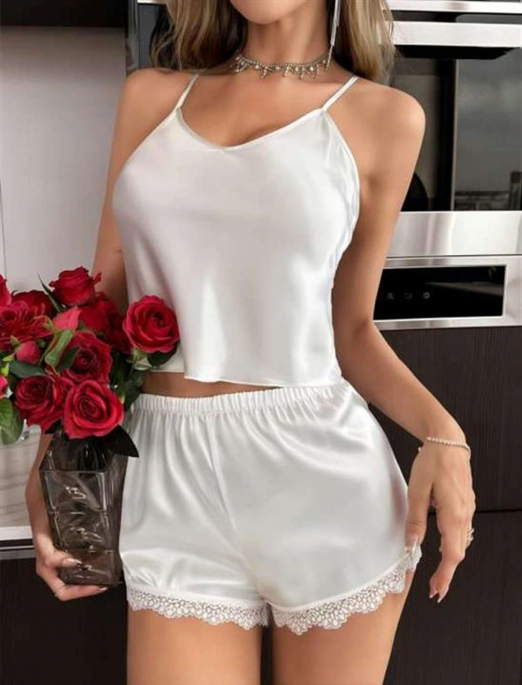?✨ Beyaz Dantel İşlemeli İnce Askılı Saten Şortlu Takım ✨?