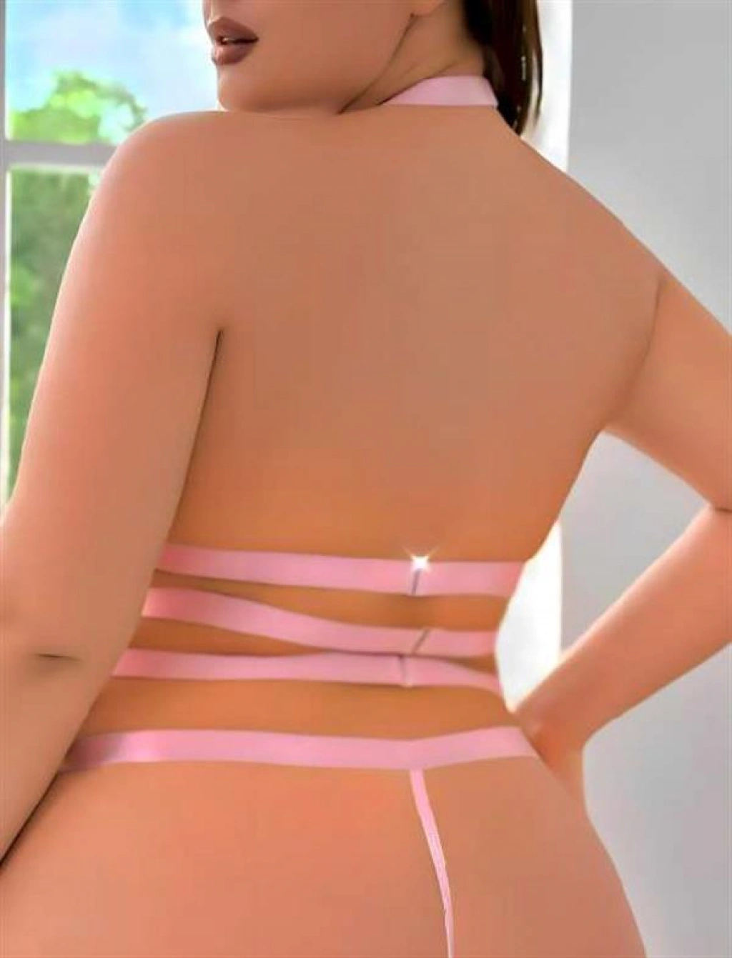 Vücudu saran yumuşak pembe tonları, dantel işlemelerin romantik dokunuşuyla buluşuyor. Zincir detayları ise bu özel tasarıma cesur ve baştan çıkarıcı bir hava katıyor. Büyük beden kalıbı sayesinde hem rahatlık hem de şıklık bir arada sunuluyor.