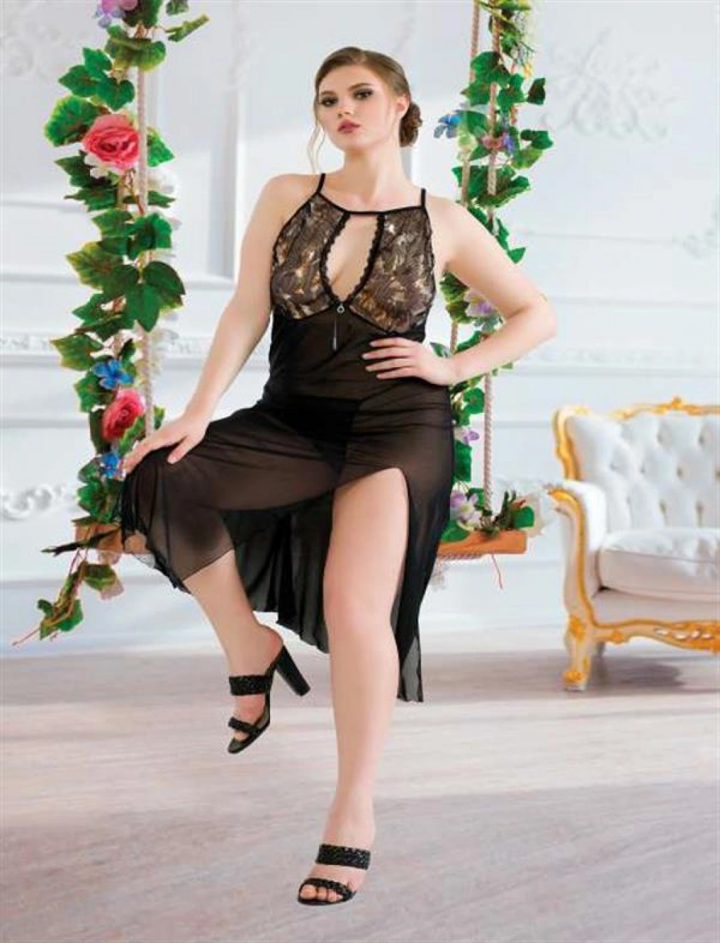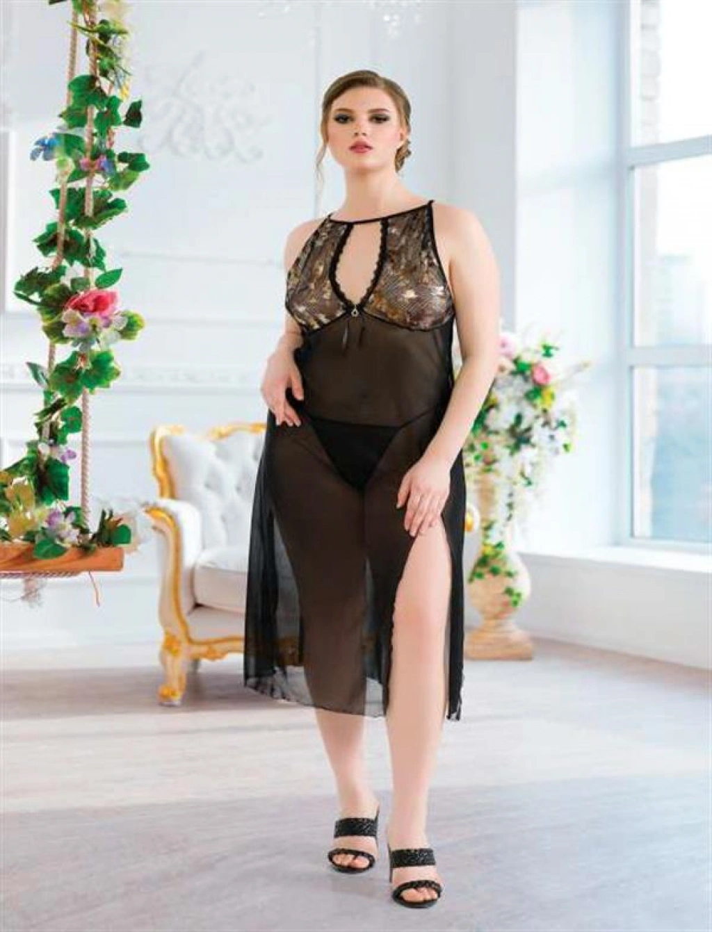 ? Büyük Beden Siyah Tül Fantezi Uzun Yırtmaçlı Gecelik ?