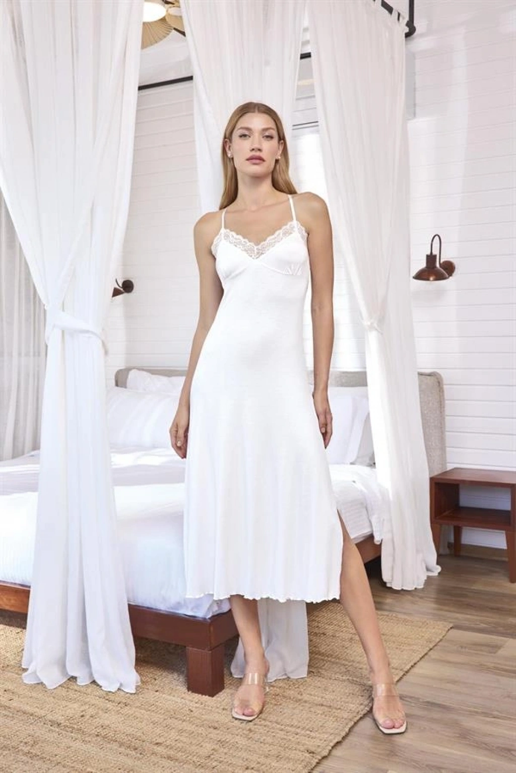 Gecelik: Beyaz renklidir, derin V Yakalıdır, göğüs ve sırt dekoltelidir, ayalanabilir ip askılıdır, yakası ve göğüs kenarları ile sırtı dantellidir, yırtmaçlıdır, örme kumaştır.
