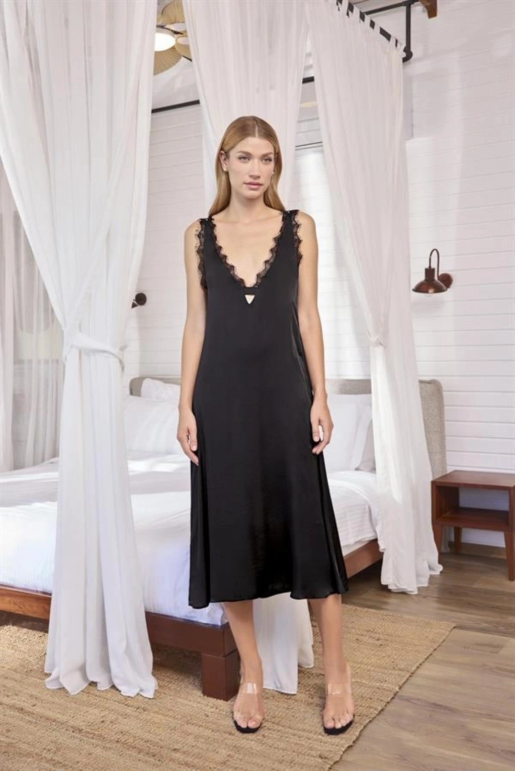 Gecelik: Siyah renklidir, derin V Yaka dekoltelidir, kalın askılıdır, yakası ve askı kenarları dantellidir, saten kumaştır.