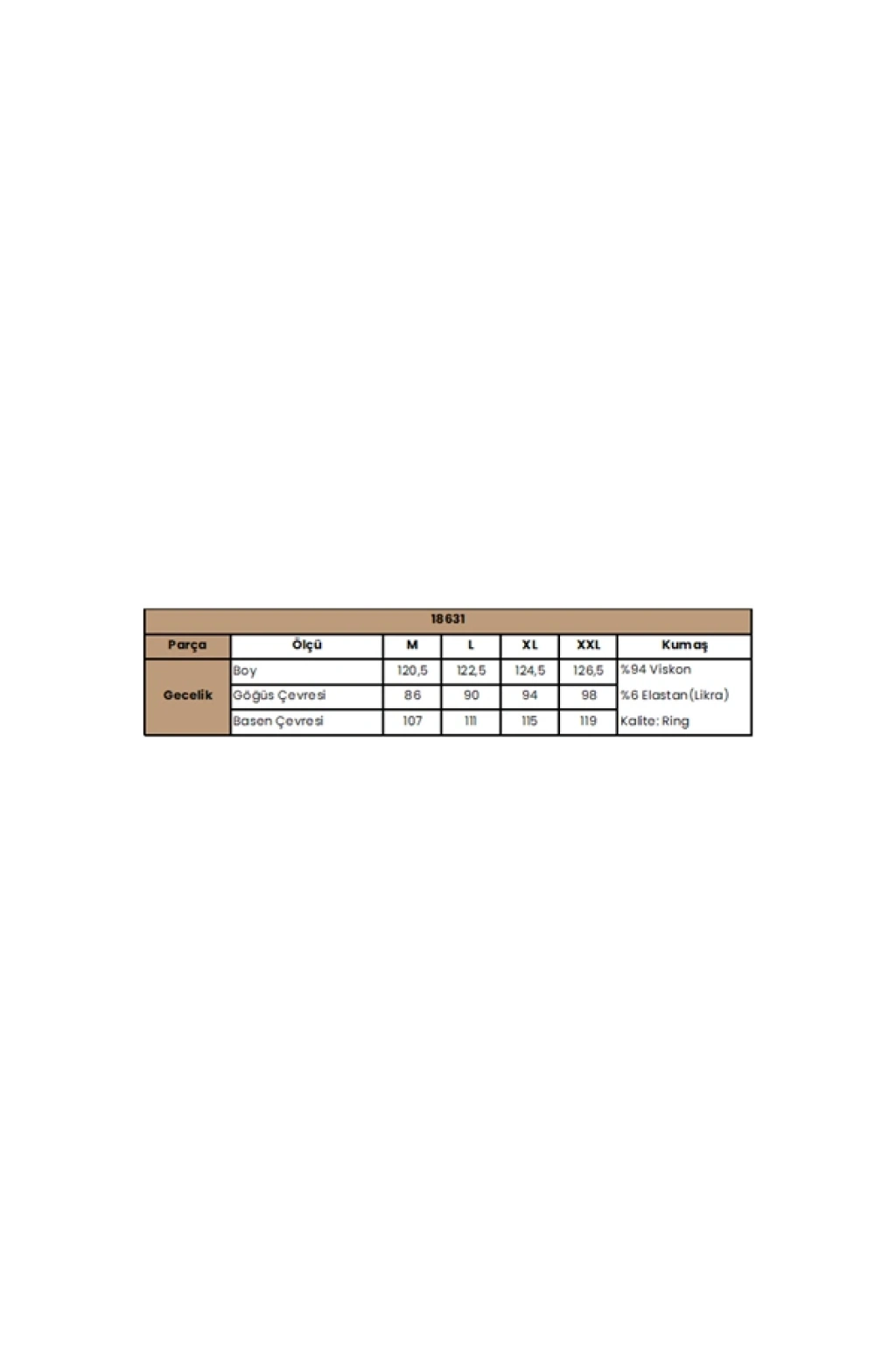 Gecelik: Siyah renklidir, derin V Yakalıdır, sırt ve göğüs dekoltelidir, kalın askılıdır, yakası,askı kenarları ve sırtı dantellidir, yırtmaçlıdır, örme kumaştır.
