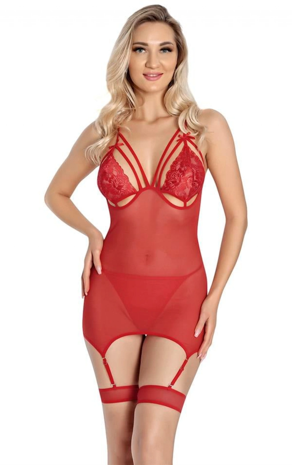 Tutkunun simgesi kırmızı, bu iddialı jartiyer takımında cesur detaylarla hayat buluyor. Göğüs kısmındaki ince dantel işlemeler ve ip detayları, feminenliği vurgularken; vücuda oturan kesimiyle baştan çıkarıcı bir siluet sunar. Jartiyer detayları ise görünümünü tamamlayarak gecenin yıldızı olmanı sağlar.