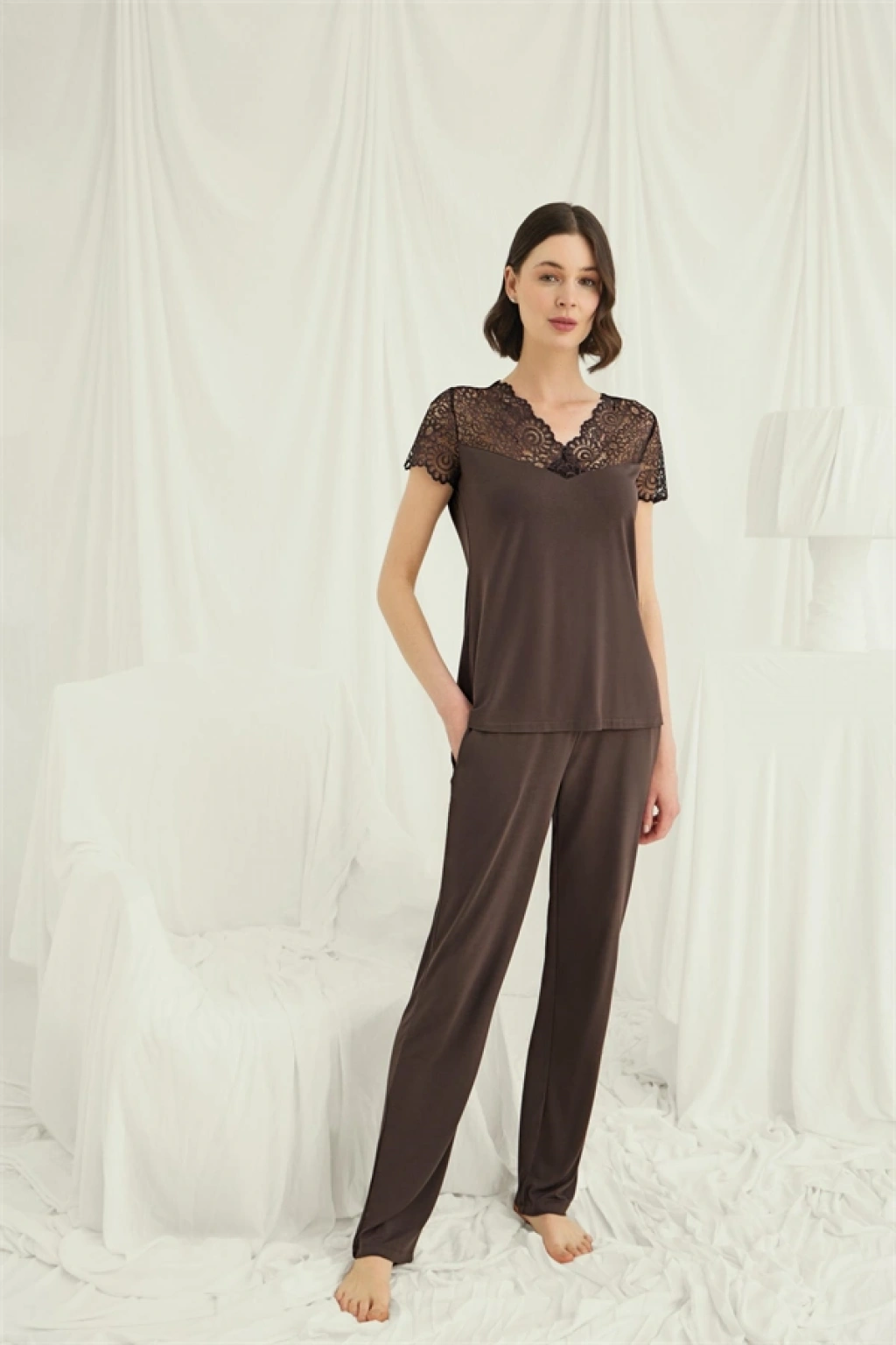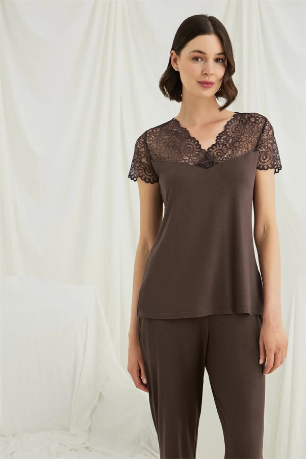 Üst: Kahverengi renklidir, V yakalıdır, kısa kolludur, yakası ve kolları ile göğüs üst kısmı dantellidir, örme kumaştır.