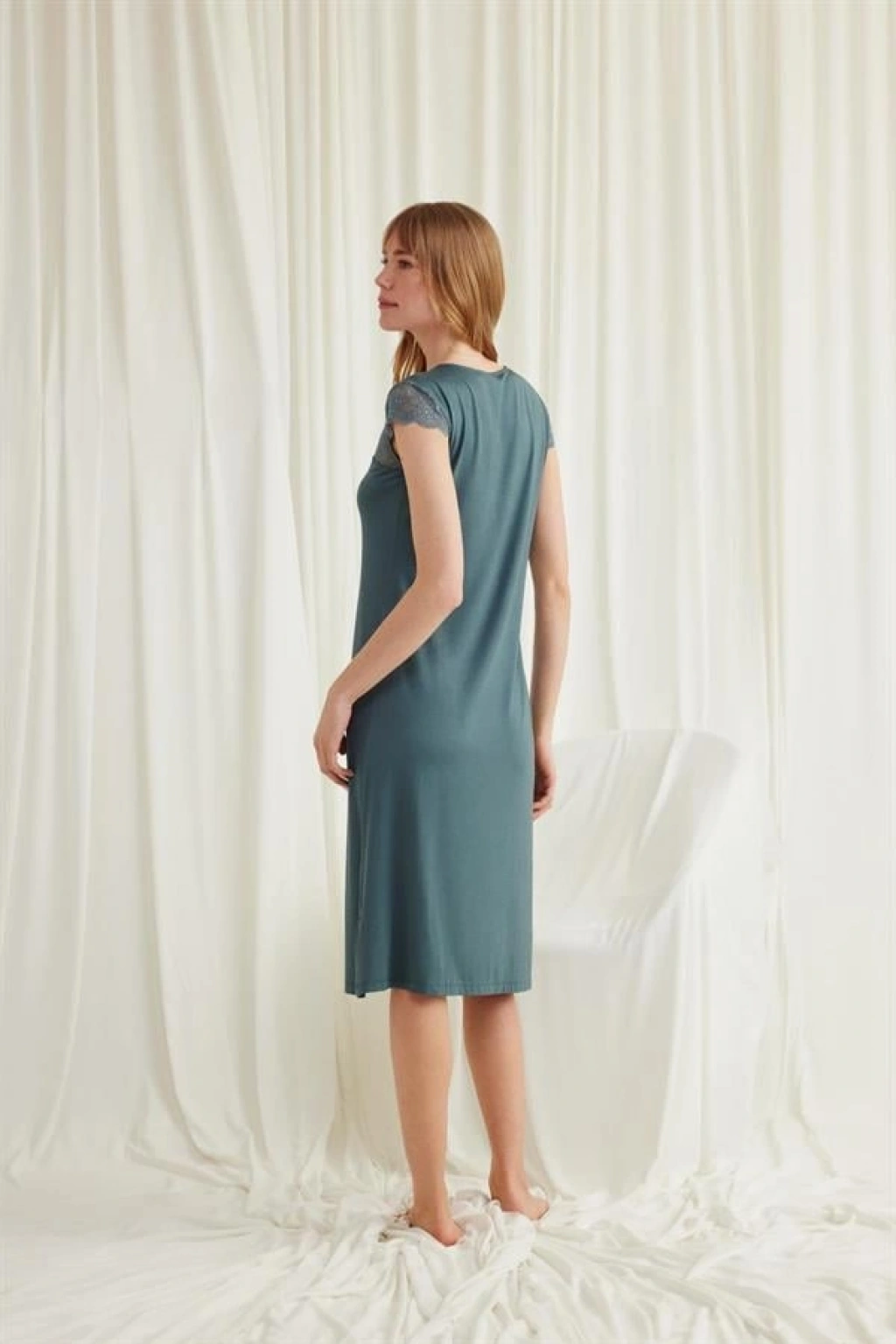 Gecelik: V yakalıdır, kısa kolludur, kolu ve omzu göğüs hizasına kadar dantellidir, yakasının altı düğmelidir, yeşil renklidir, örme kumaştır.