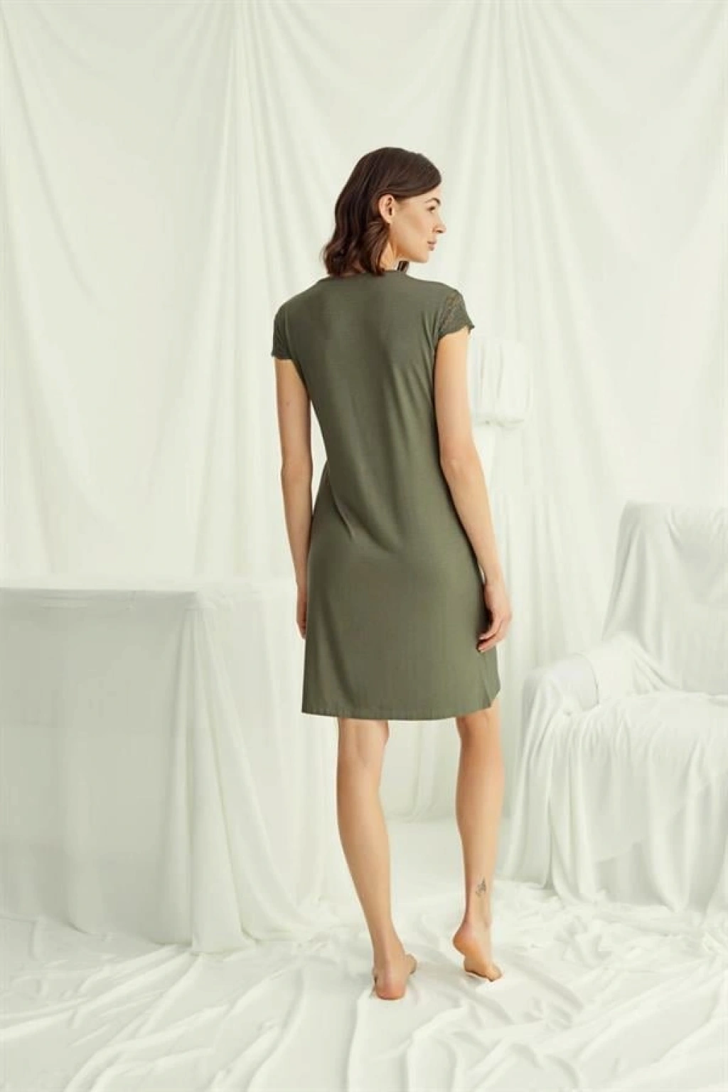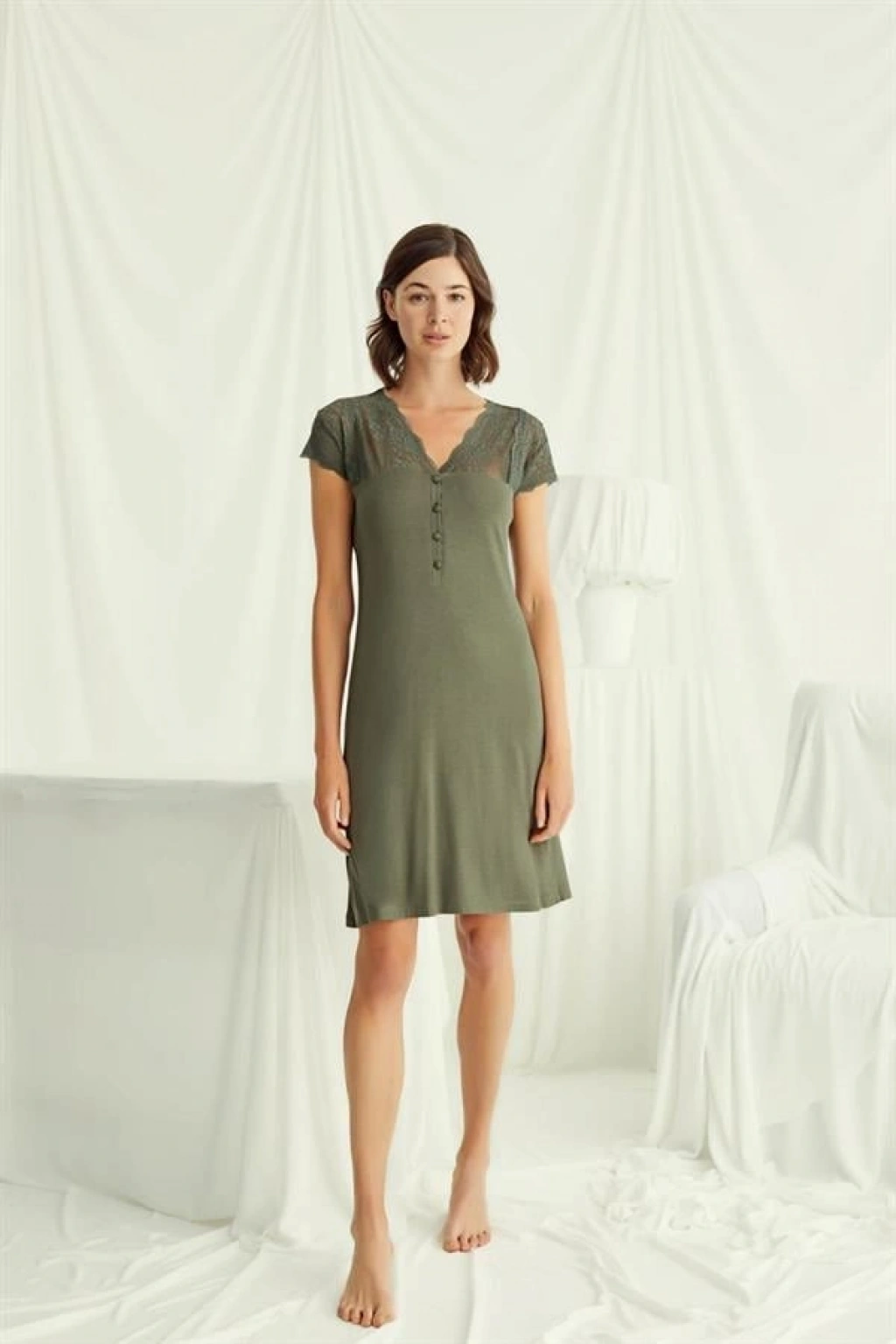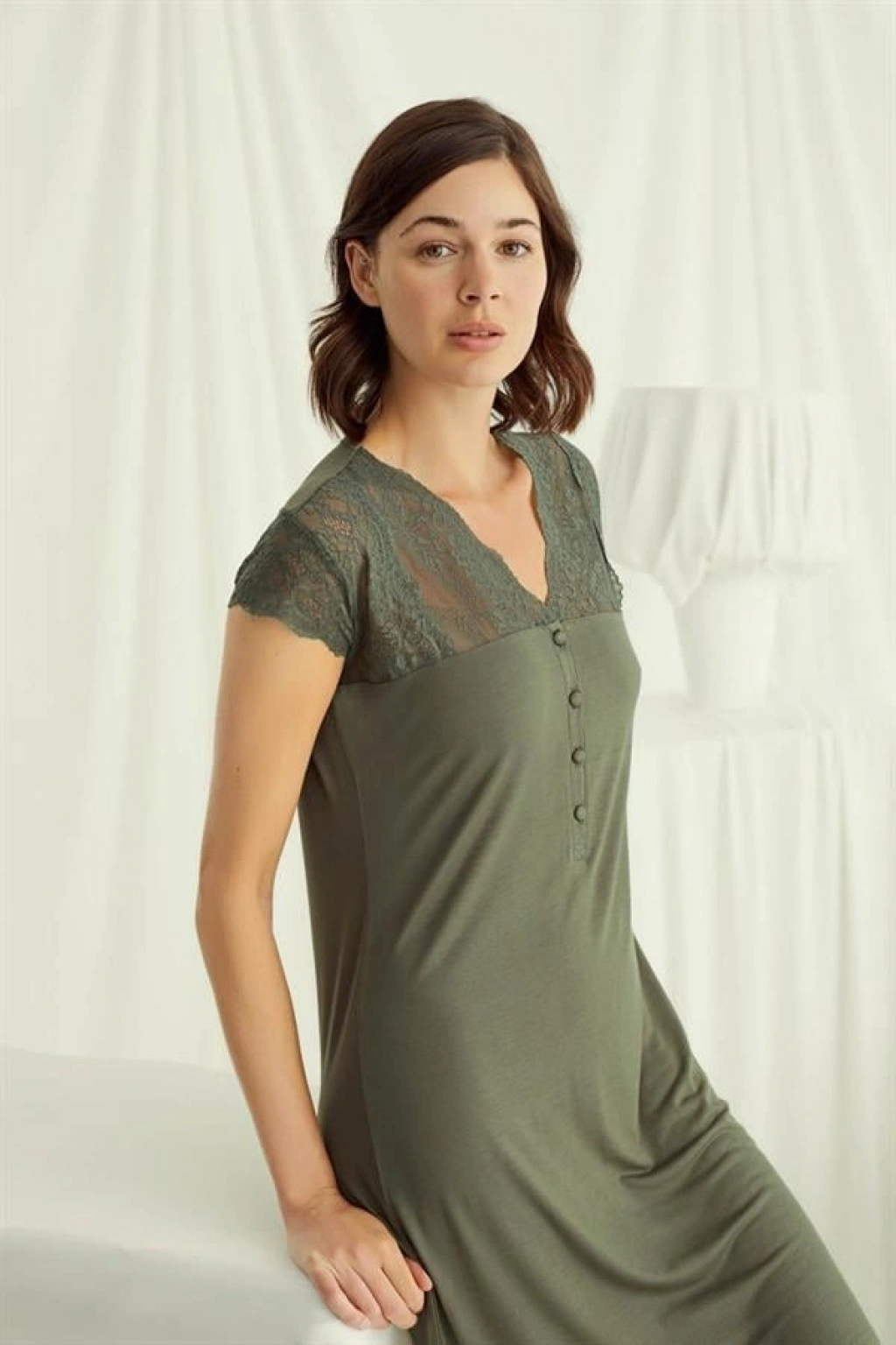 Gecelik: Haki renklidir, V yakalıdır, kısa kolludur, kolu ve omzu göğüs hizasına kadar dantellidir, yakasının altı düğmelidir, örme kumaştır.
