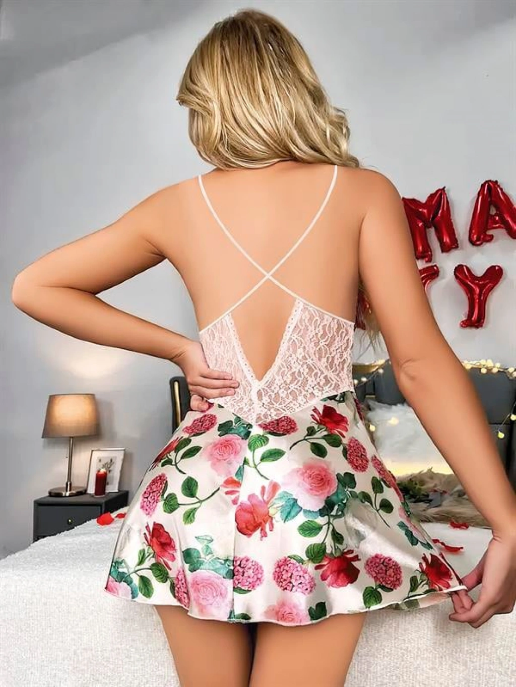 Özel Tasarım Gül Desenli İnce Askılı Dantel İşlemeli Mini Saten Gecelik, feminen detayları ve romantik tasarımıyla özel anlarınıza zarafet katar. Göğüs kısmındaki zarif dantel işlemeler ve gül desenleri geceliğe romantik bir hava verirken, ince askılı yapısı şık ve hafif bir görünüm sunar.