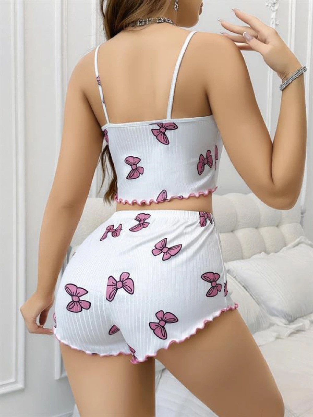 Yumuşacık pamuklu kumaşı ve fitilli dokusuyla konforu ön planda tutan bu pijama takımı, beyaz zemin üzerindeki pembe kurdele desenleriyle zarif ve feminen bir görünüm sunar. İnce askılı üstü ve elastik bel şortu ile yaz akşamlarınızın rahatlığına şıklık katıyor.