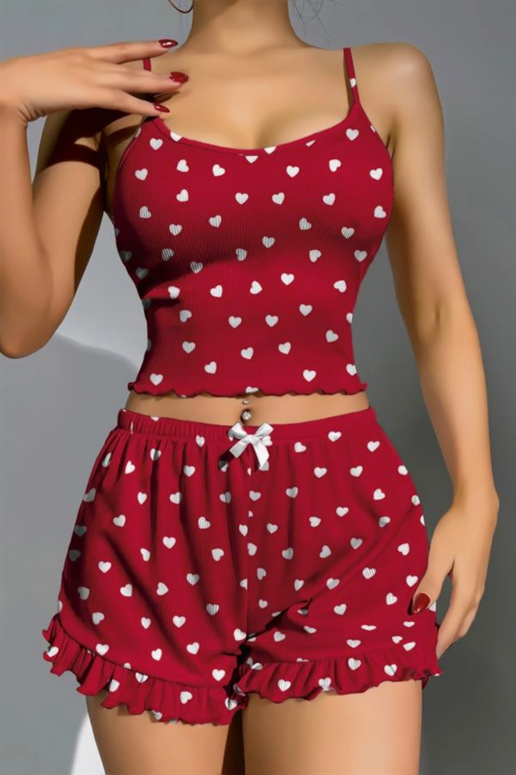 ❤️? Pamuklu Kırmızı Üstüne Beyaz Kalp Desenli Fitilli Askılı Şortlu Pijama Takımı