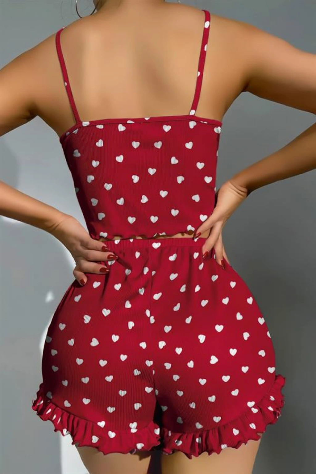 Aşkın enerjisini üzerinde taşı! Kırmızı zemin üzerindeki beyaz kalp desenleriyle dikkat çeken bu fitilli pijama takımı, %100 pamuklu yapısıyla tenine nefes aldırır. İnce askılı üst ve esnek bel yapısına sahip şortuyla yaz gecelerinde konforu ve şıklığı bir arada sunar.