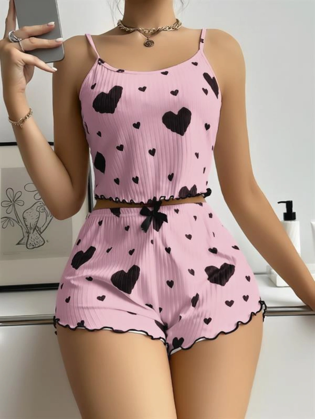 Yumuşacık pamuklu kumaşı ve fitilli dokusuyla konforu şıklıkla buluşturan bu pijama takımı, pembe zemin üzerindeki siyah kalp desenleriyle sevimli ve modern bir hava sunar. İnce askılı üstü ve elastik bel şortu ile yaz akşamlarınızın favorisi olacak.