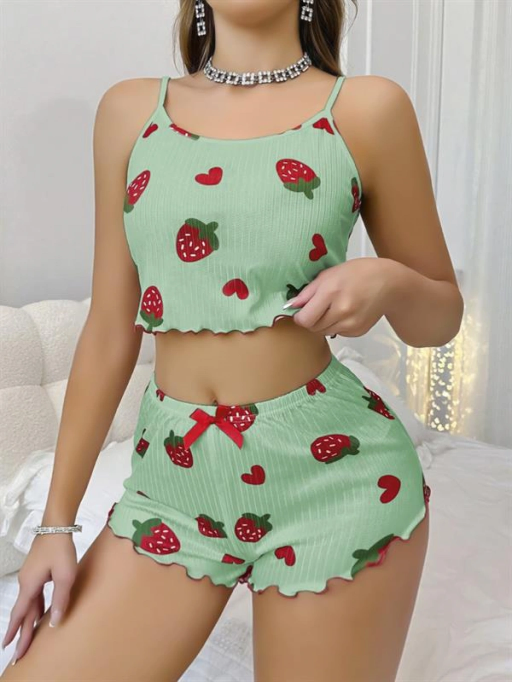 ?? Pamuklu Yeşil Üstüne Çilek Desenli Fitilli Askılı Şortlu Pijama Takımı