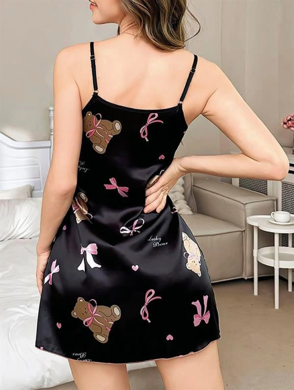Yumuşacık saten kumaşın üzerinde zarif ayıcık desenleriyle tasarlanan bu mini gecelik, gece şıklığını tatlı bir dokunuşla tamamlıyor. İnce askıları ve dökümlü formuyla vücudu nazikçe sararken, hem rahatlık hem de göz alıcı bir görünüm sunar.
