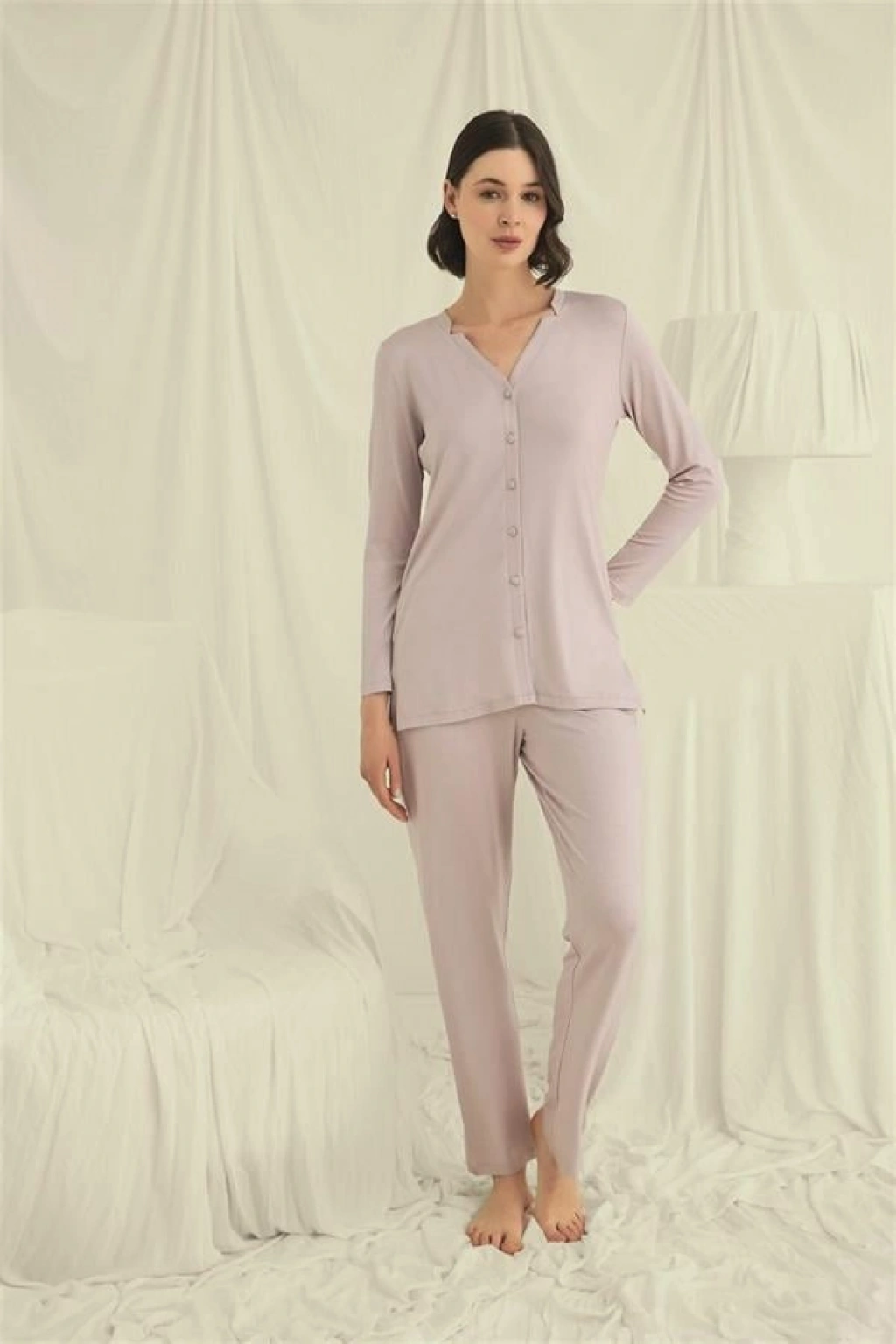 Üst: Vizon renklidir, V yakalıdır, önü boydan düğmelidir, uzun kolludur, örme kumaştır.Alt: Vizon renklidir, ceplidir, örme kumaştır.