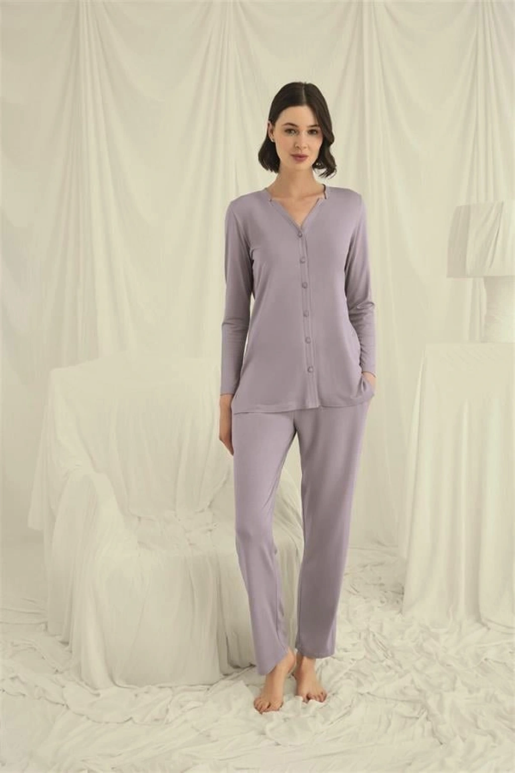 Üst: Gri renklidir, V yakalıdır, önü boydan düğmelidir, uzun kolludur, örme kumaştır.Alt: Gri renklidir, ceplidir, örme kumaştır.